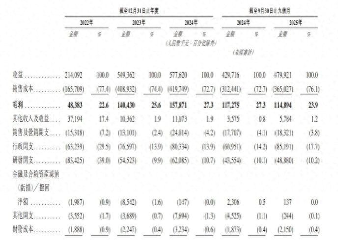 但另一方面,期间费用率却出现异常波动。2022年由于营收基数低,销售、行政、研发三项费用合计占营收比重高达75.7%。随着营收爆发,2023年三项费用率骤降至26.2%,展现出良好的经营杠杆。然而好景不长,2024年三项费用率反弹至28.8%,2025年前九个月进一步攀升至28.4%。特别是行政开支,2025年前九个月达到6095万元,已接近2024年全年的8033万元,费用增长的刚性远高于营收增速,表明公司内部管理效率或随规模扩张而出现下降,侵蚀了来之不易的毛利改善成果。