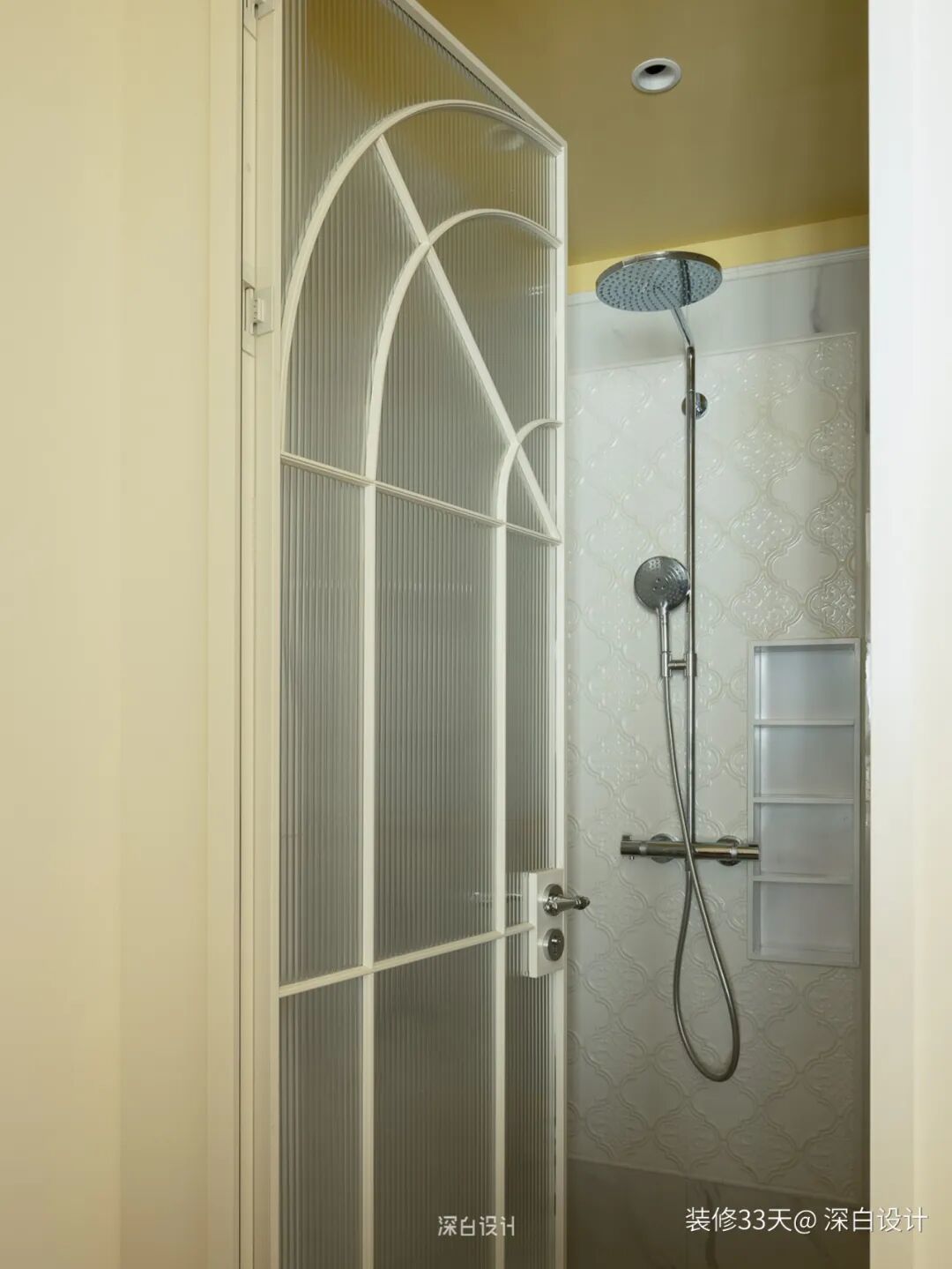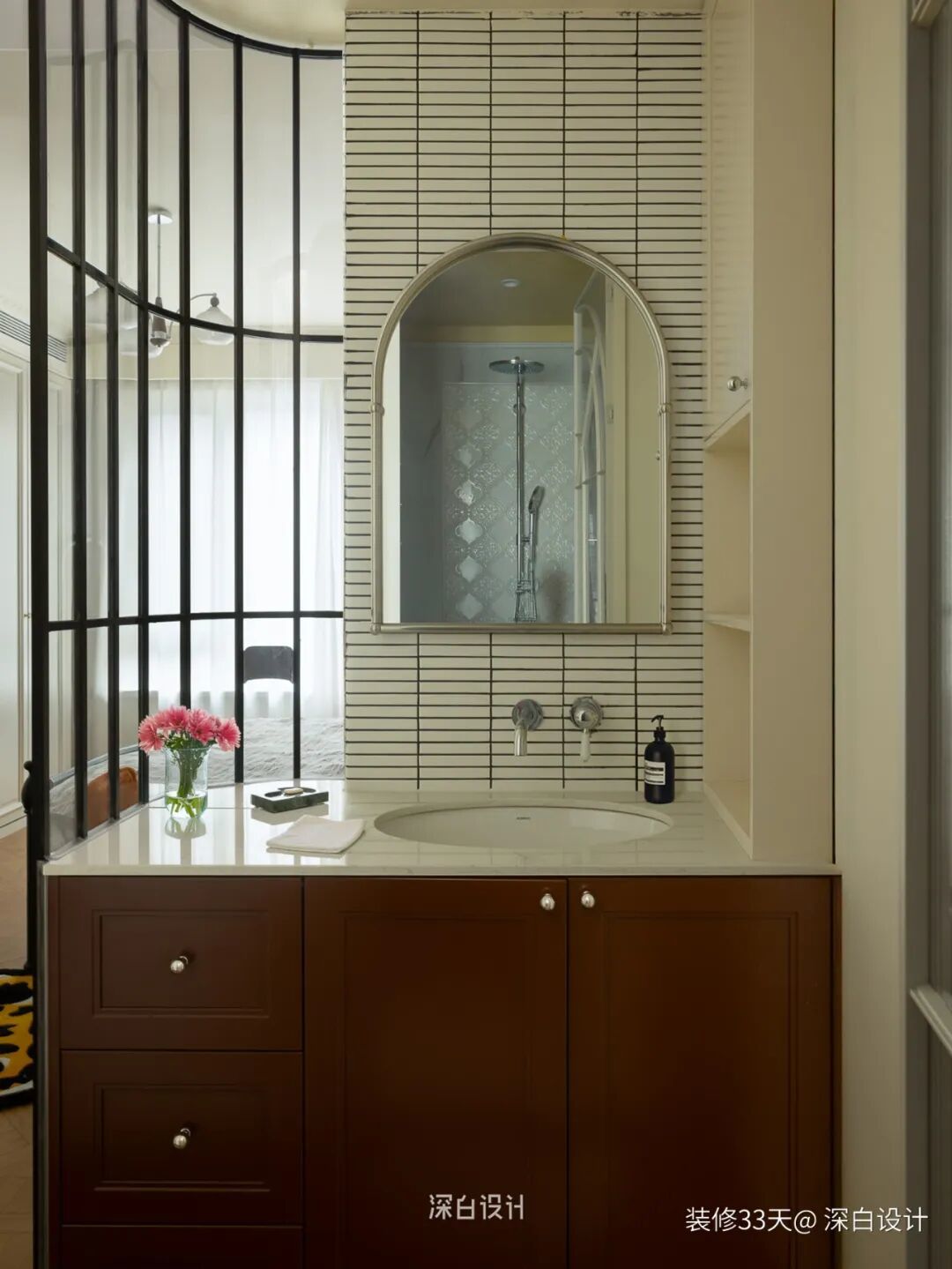 ▲ 主卫干区设计弧形玻璃隔断,颜值和透光性都恰到好处