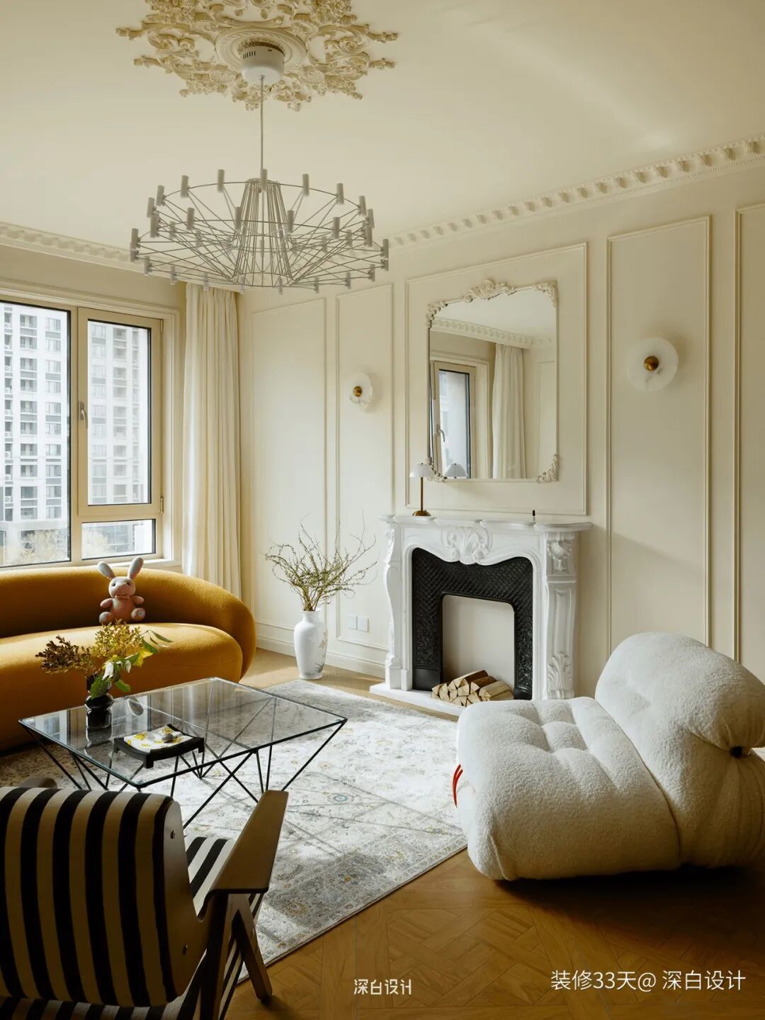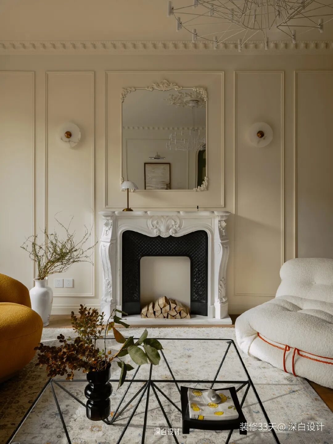 ▲ 定制法式壁炉作为客厅视觉核心,上方悬挂一面雕花镜子,尽显法式复古浪漫