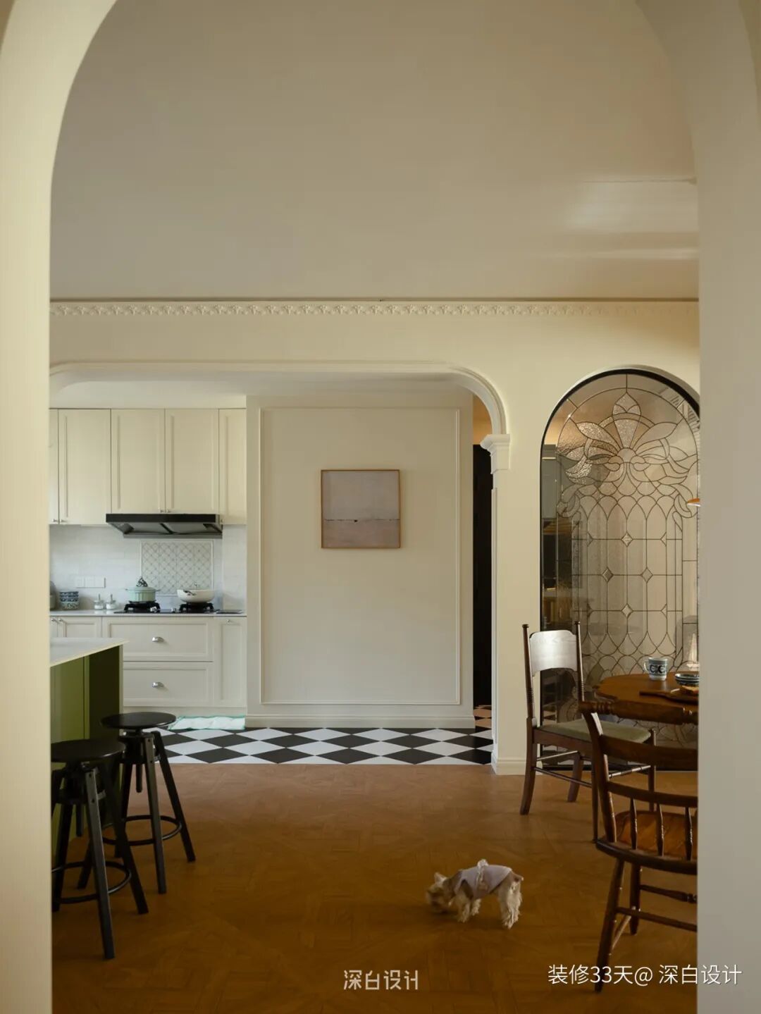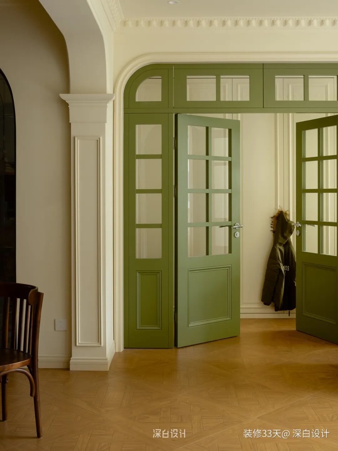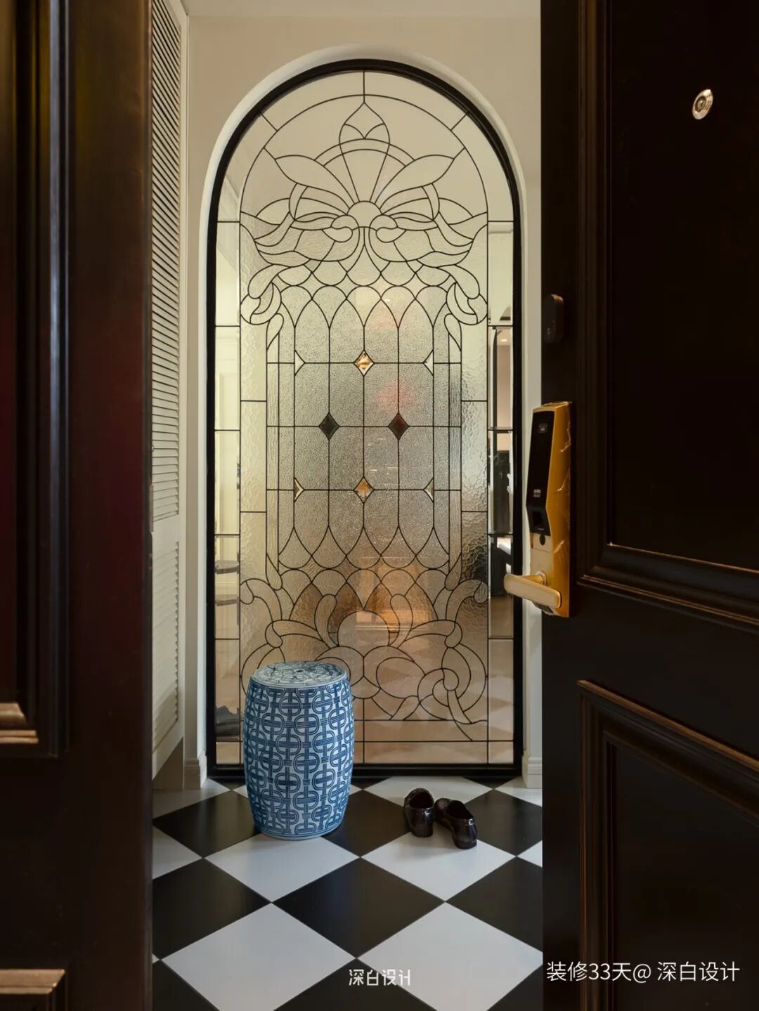 ▲ 重构入户动线,正对增设一面拱形复古玻璃隔断,以通透质感与柔美弧线打造一步一景的过渡层次,提升入户仪式感
