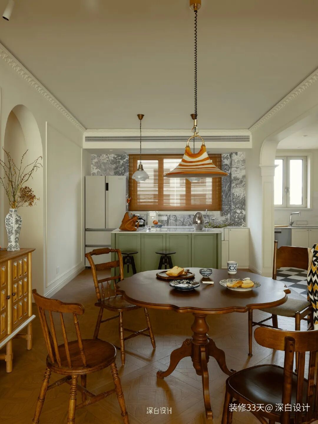 ▲ 利用餐厅空间增设西厨区域与岛台,原窗户过高不好看,所以整面墙贴了法式壁纸,强调墙面效果
