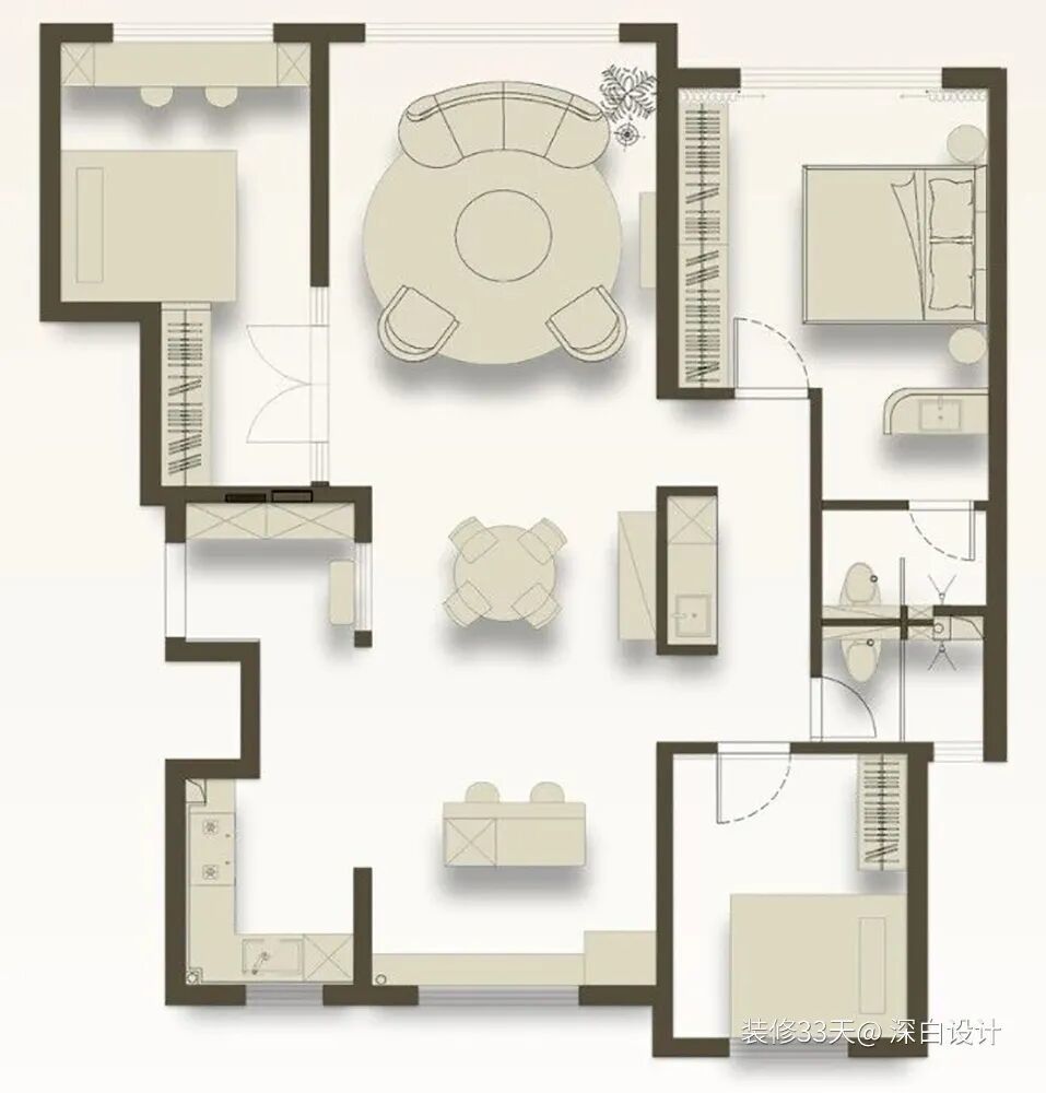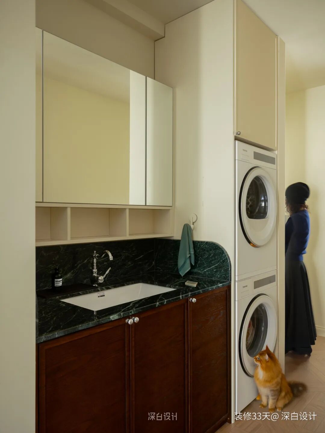 ▲ 将原先主次卫的竖向空间调整为横向空间,在过道中间设置次卫干区与洗衣区,形成高效的洄游动线