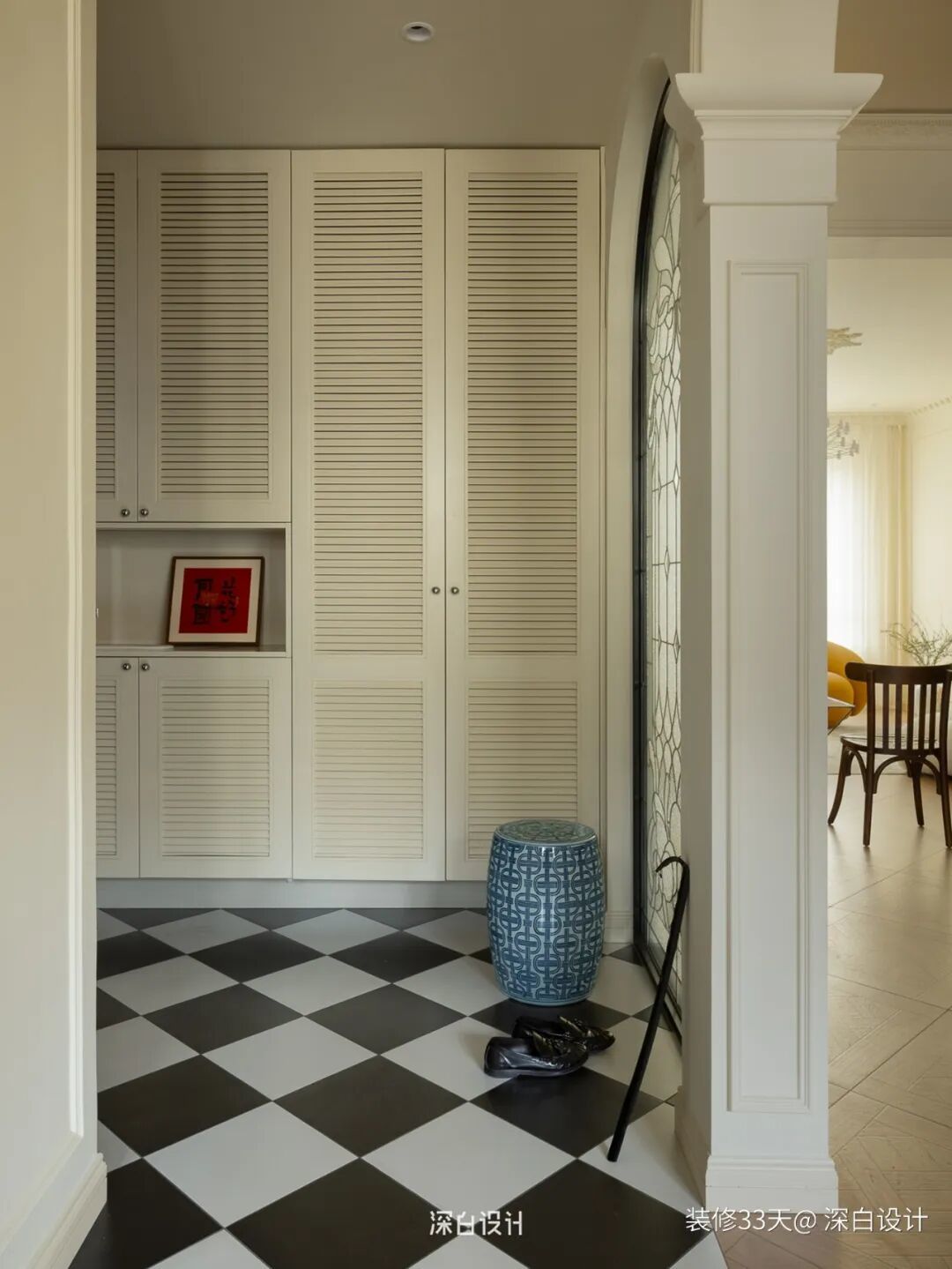 ▲ 将与玄关相邻的厨房打通,地面通铺经典棋盘格瓷砖,黑白交织的复古韵律贯穿两个区域