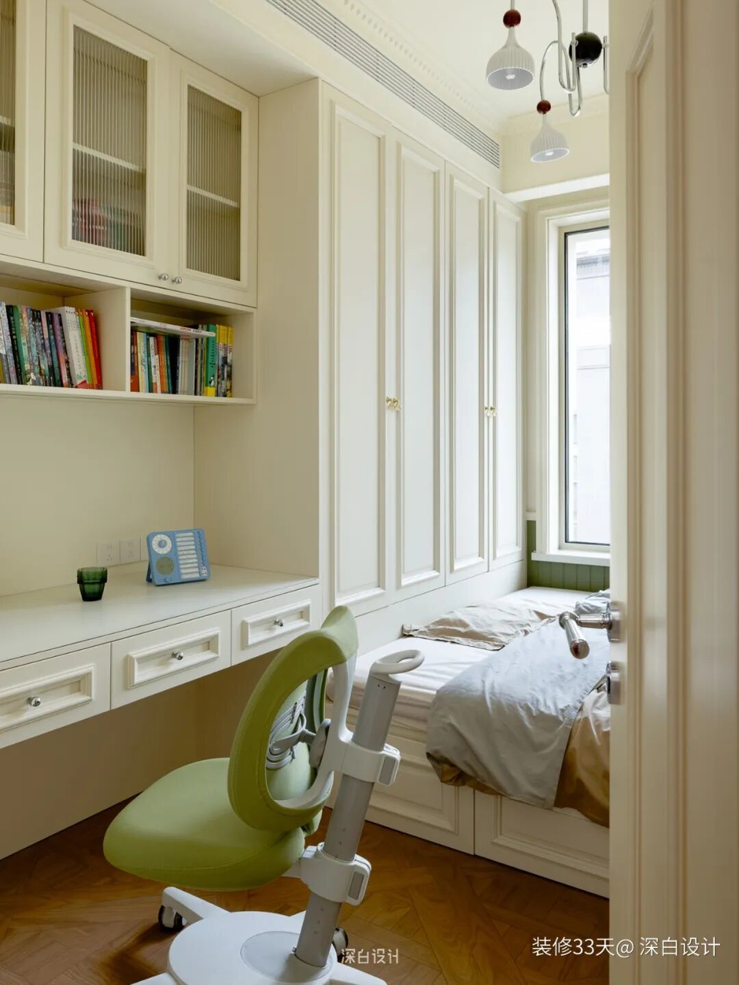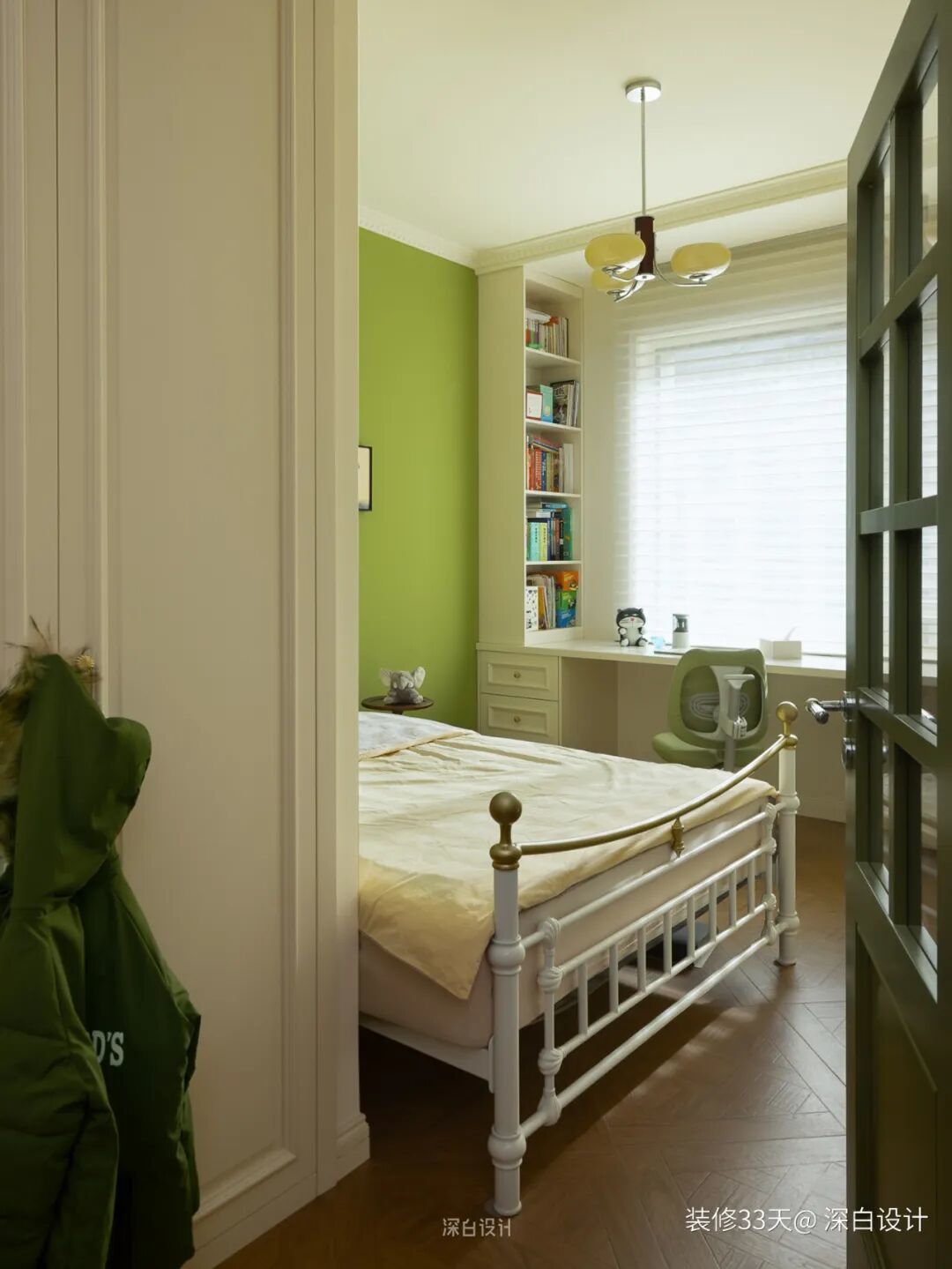 ▲ 儿童房内部以活力绿色为主调,沿窗定制书桌,侧面延伸设计一列书架