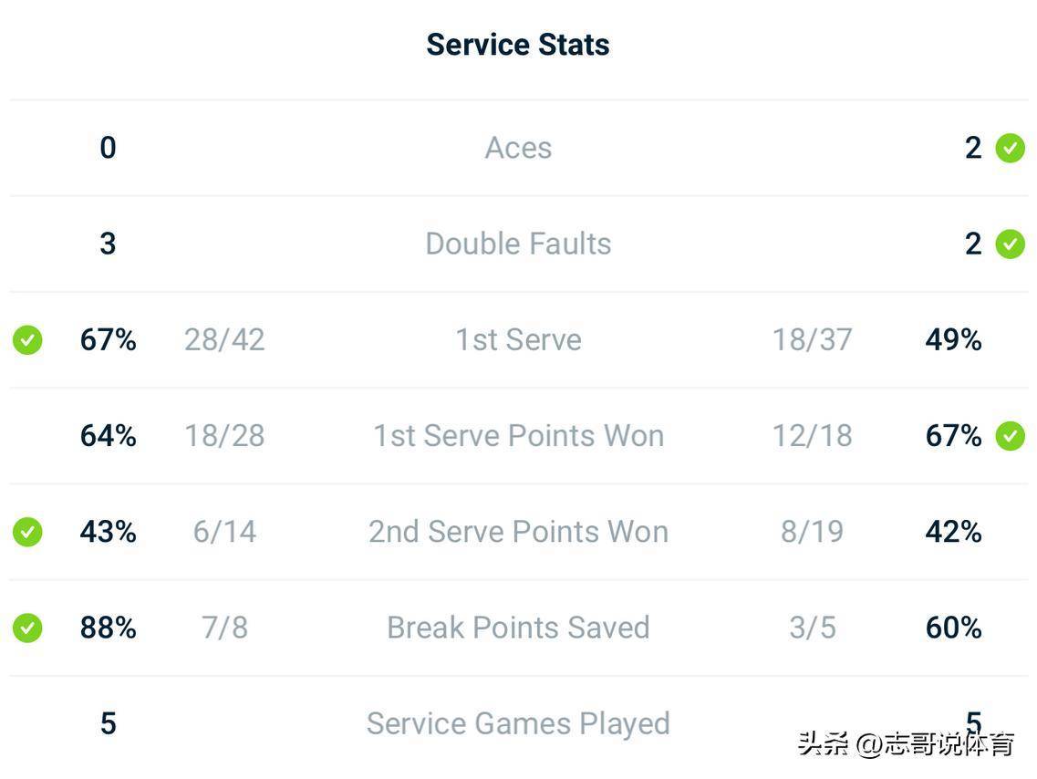 数据统计显示,首盘郑钦文发出了两个ACE球,双误2-3控制得要更好一些!不过她的一发进球率只有49%、远落后于对手,在破发点的兑现上,郑钦文也明显落后于路鲁季奇(8个破发点仅兑现1个、鲁季奇5个破发点兑现2个)。